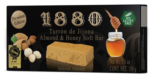 Turrón blando de Jijona clásico y tradicional por excelencia más reconocido de la marca 1880, una de las marcas más valoradas de turrón y dulces navideños por su exquisita textura cremosa y delicado sabor de elaboración artesanal, para los paladares turroneros más exigentes. El postre estrella de su mesa de Navidad. Elaborado con Almendra Seleccionada (70%) y Miel de Azahar, origen España. El Turrón 1880 es un turrón de la más alta calidad elaborado de forma artesanal en la provincia de Alicante. Este turrón es reconocido por su calidad y exquisito sabor. Turrones 1880 es una marca que nace en España, en concreto en la provincia de Alicante. El origen del turrón se remonta a la época de los árabes. En el siglo XV llega a nuestro territorio. Este dulce se elaboraba hasta el siglo XVIII únicamente con Almendra y Miel. ¡Descubre todos los productos de turrones 1880 en nuestra tienda online de productos gourmet de Navidad!